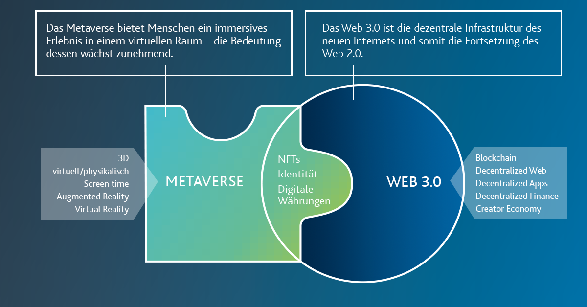 Die Begriffe Web3 und Metaverse werden fälschlicherweise oft gleichgesetzt. Die Bezeichnung Web3 beschreibt ein Set von Technologien, welche die Entwicklung dezentraler Webanwendungen unterstützen (siehe folgend zum Beispiel Peer-to-Peer und Blockchain). Kurz gesagt, ist das Web3 also eine technologische Basis für das Metaverse, nicht „das Metaverse“ selbst. Zudem gibt es Metaverse-Anwendungen, welche die Web3-Technologien nur teilweise oder gar nicht nutzen.